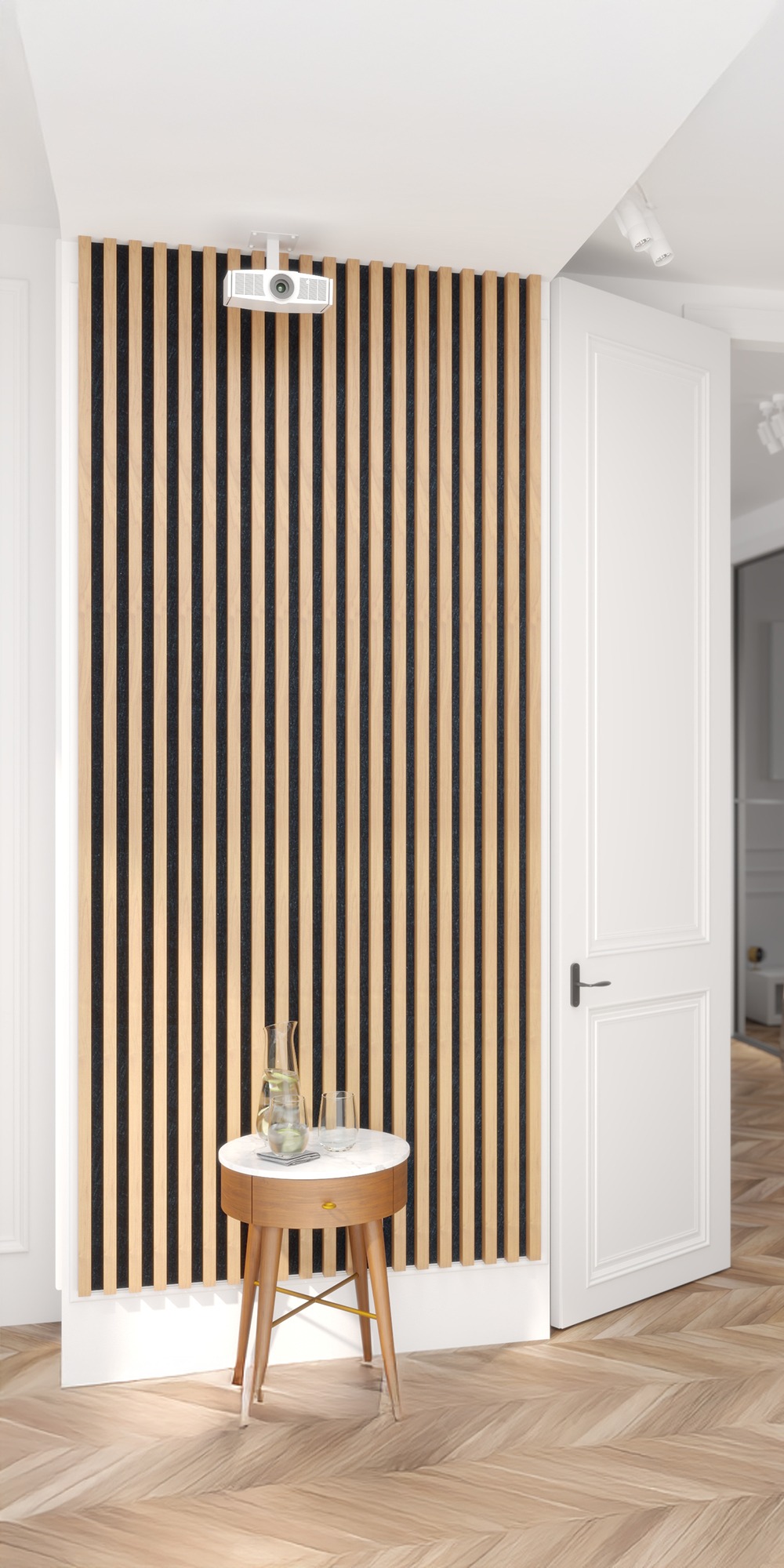 Dzięki zastosowaniu filcu akustycznego lamele pochłaniają odbijający się dźwięk, pochodzący np. z kina domowego w salonie. Oznacza to, że czas pogłosu znacząco się skraca, tym samym jego odbiór jest przyjemniejszy i przejrzysty dla ucha.
