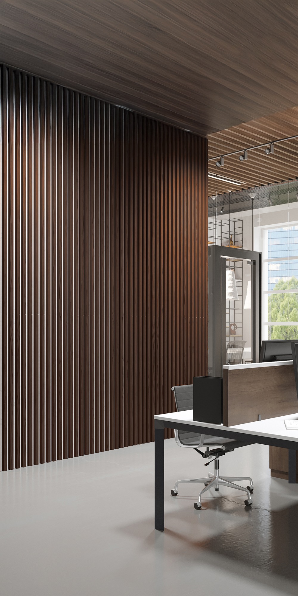 Lamele na filcu to nie tylko doskonała kompozycja i dekoracja wnętrz. Panele świetnie wygłuszają dźwięk, jak również eliminują efekt echa w pomieszczeniu.