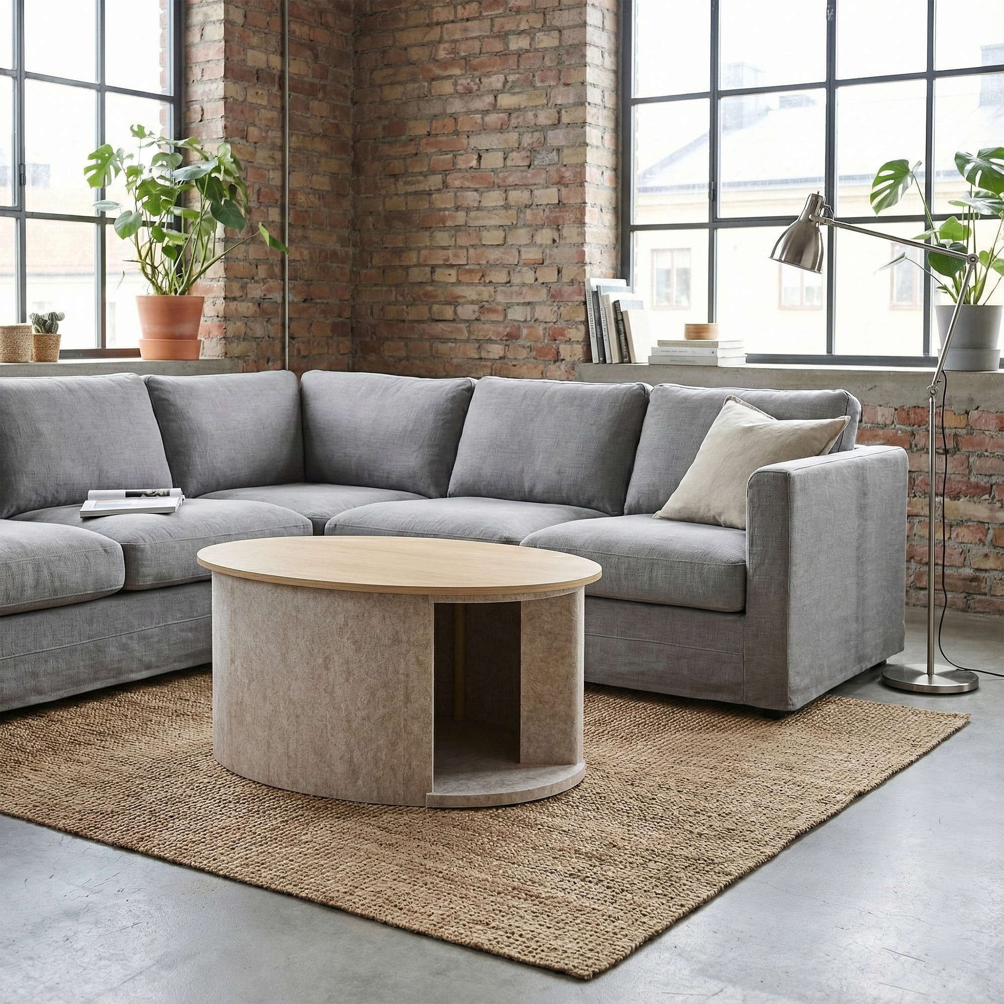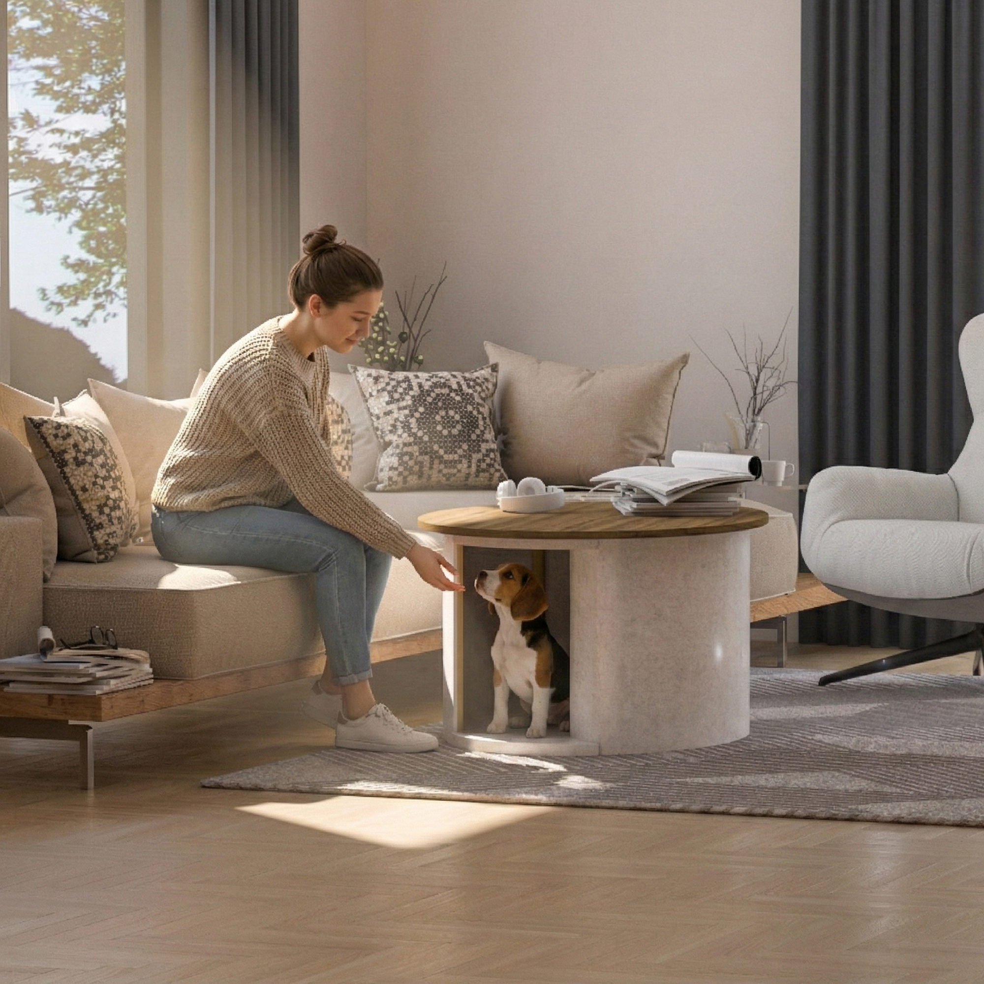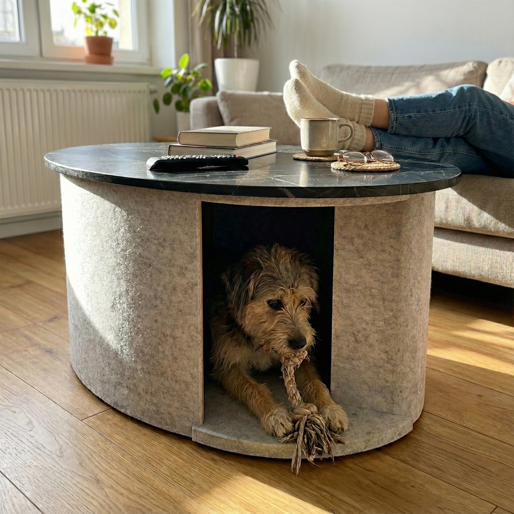 Elegancki mebel łączący komfortowe schronienie dla pupila z funkcjonalnym stolikiem kawowym w nowoczesnym stylu.