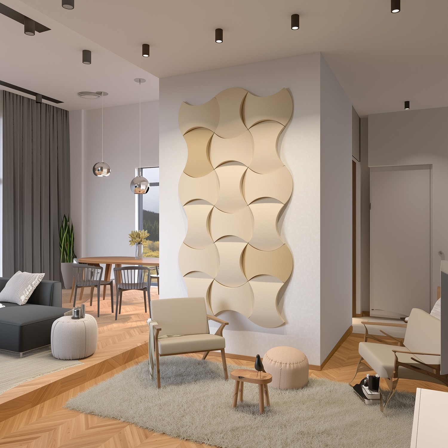 Rytmiczny profil Bend subtelnie modeluje światło i cień na ścianie, nadając głębi przestrzeni. Modułowa konstrukcja pozwala tworzyć falujące kompozycje, które przyciągają wzrok i ożywiają monotonne powierzchnie.
