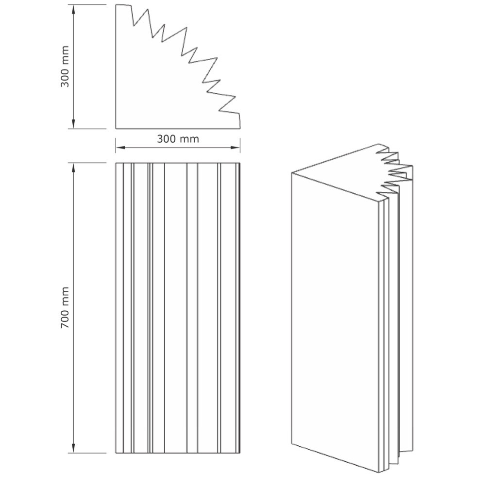 Zaprojektowany do montażu w narożnikach pomieszczeń, gdzie kumulują się fale dźwiękowe. Profilowana powierzchnia nie tylko pochłania dźwięk w newralgicznych punktach, ale stanowi elegancki element dekoracyjny rogu.