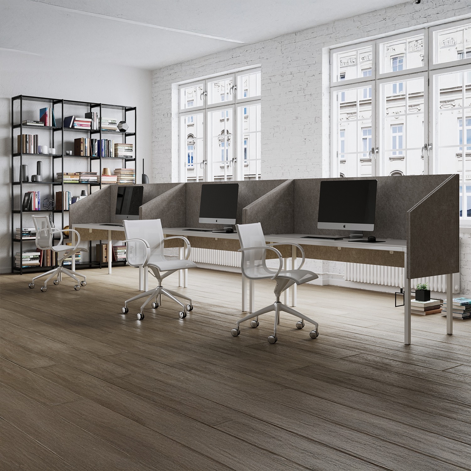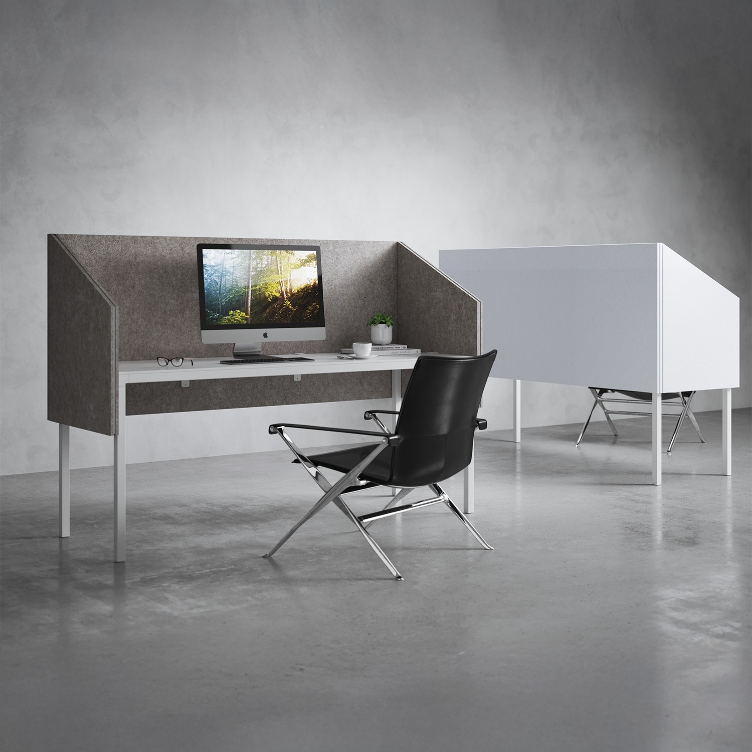 System trzech niezależnych paneli (2 boczne + 1 frontowy) umożliwia pełne otoczenie stanowiska pracy. Zapewnia ochronę akustyczną z trzech stron, tworząc kameralną przestrzeń do skupienia.